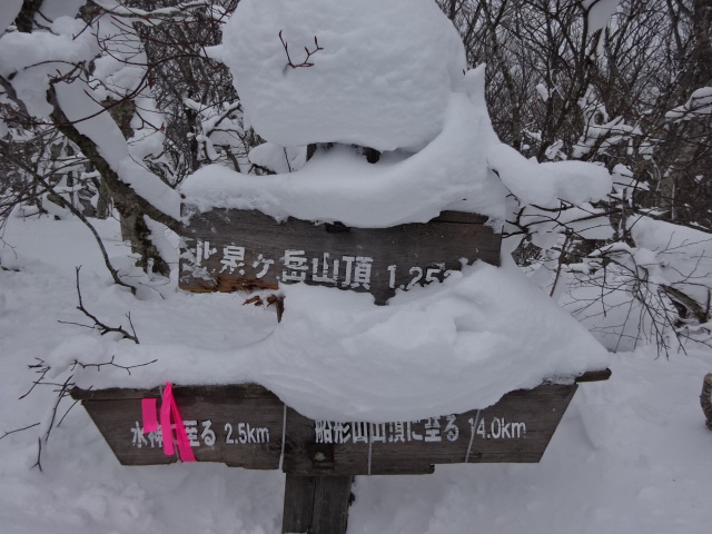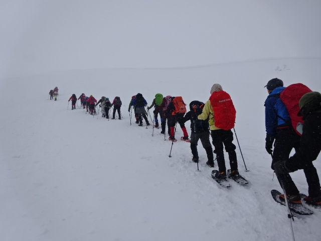 | 2026.01.17 北泉ヶ岳 (会27名) 年明け会山行の始まりは近くの雪山が多いが、今年は北泉ヶ岳で、テンクラ予報がCと怪しかったが、泉ヶ岳スキー場の駐車場は青空の風もなしで儲けもの。色とりどりのワカンやスノーシューを背負って出発。登山口に来るとやや雪があるもののツボ足OKで、その後勾配を増してアイゼン装着し、水神には夏時間と同じ1:15で到着。一休みして、渡渉後の杉林を過ぎると雪が柔らかくなり今度はワカンに履き替える。そして黒鼻山分岐辺りから風が出てきた。標高も1000mになって更に積雪を増しスピードダウンで、やっと泉ヶ岳分岐の三又路。ここから鞍部に降りると今はブナの大木群だが、かつて昭和25年に泉ヶ岳から三峰山まで登山道開発した五百城さんはここを四本桂と命名したが今は見当らない。そして夏道では見られない北泉が目の前で、最後の急登を踏んばると北泉ヶ岳山頂。27名狭い山頂でバンザイ。 |