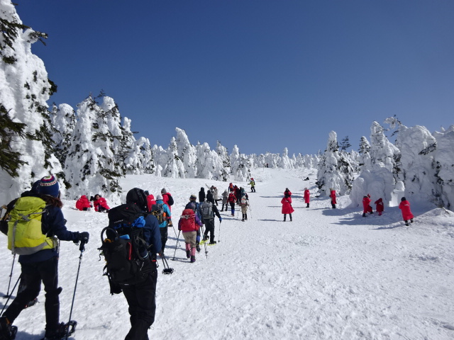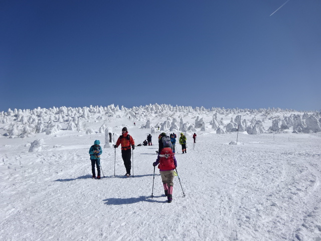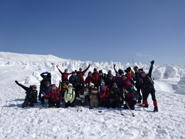 | 2026.02.15 仙人沢アイスガーデン (会28名) 恒例の蔵王樹氷トレッキング。今年は仙人沢アイスガーデンをプラス。先日まで暴れに暴れた日本海低気圧は2月中旬になって静まり、それ以上に28人もの大の小学生1クラスのパワーか晴れに晴れた。リフトの大行列は我がお兄さんお姉さんで、サングラスで年齢詐称かあっち向いてホイ。リフトを降りてアイゼンスタート。人気のコースだけに雪は閉まり、急坂も難なく降りてアイスガーデン到着。前回は折れていたが今年はバッチリ、隣では元気な氷登りも。氷下は自己責任よのLの言葉に、ワゲイスタ~ズはキャアキャア。そして辛い登り返しを終え、いよいよ樹氷原に出て昼食の御田ノ神避難小屋まで。AAA素晴らしい。青空の樹氷原。新世界、天国、桃源郷、ユートピア。来て良かったあ。初めての方も大興奮。もう世界遺産を超えている。 |